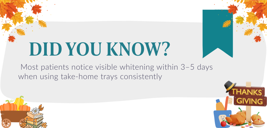 There’s a reason so many patients choose take-home whitening in November. It’s flexible, subtle, and ideal for anyone who wants to look refreshed before the holidays without spending extra time in the dental chair.