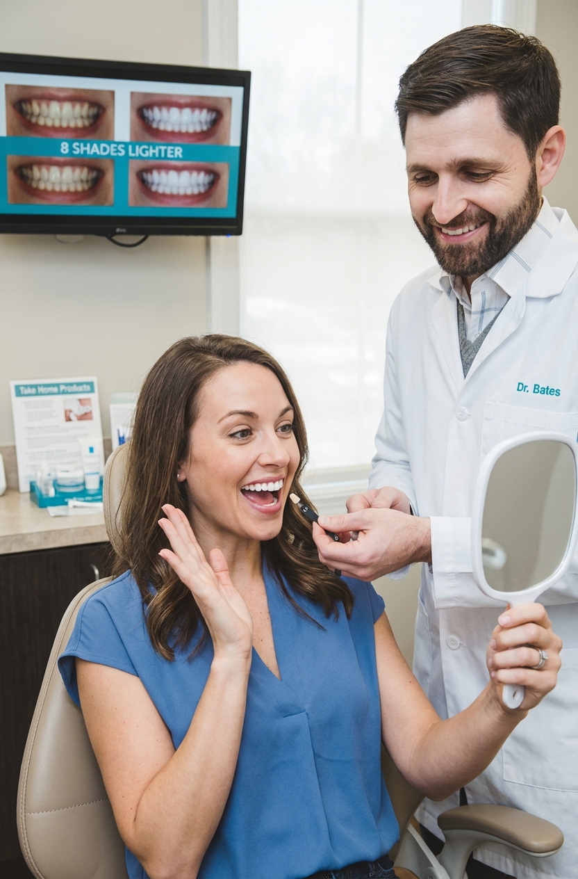 If you choose take-home trays, you can even do periodic touch-ups to refresh your smile when needed. We’ll guide you on how often to use them safely.